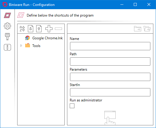 Biniware Run vous permet de créer et de conserver vos raccourcis au même endroit